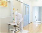 作業服についた毛髪などの付着物を、粘着ローラーで念入りに取り除きます。ローラー掛けは、頭の先からつま先まで、手順に従って1分以上掛けます。