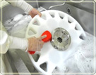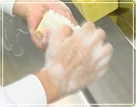 食品衛生の基本は手洗いです。これも手順に従って石鹸で洗った後、爪ブラシを使って念入りに洗います。この後、水分をペーパータオルで拭き取り、アルコール消毒を行います。