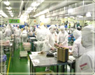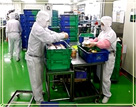 ここで、弁当、おむすび、スナック麺、調理パンなどの盛付け(トッピング)を行います。ここは当社でも一番の清潔ゾーンなので、定時に衛生タイムを設け、ローラー掛けや手袋交換・アルコール消毒を行います。盛り付け工程では、指示書に従って規格通りの盛り付けを行います。